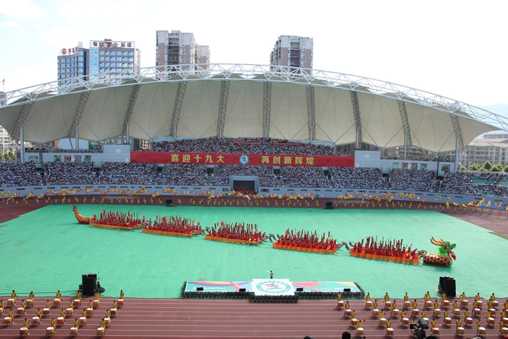 开幕式当天,院党委副书记孙彤、副院长罗向东亲自带队,全体学工人员,近千名参演学生,四千余名观看学生,搭载120辆公交汽车,浩浩荡荡开往怀化体育馆,去参加这一场体育盛会。开幕式表演共有《梦想》、《奋进》、《拼搏》、《幸福》四个篇章,我院学子是第二个篇章《奋进》的表演单位,演出时长8分钟,融入了传统龙舟、大鼓、帆旗、传统武术等表演元素,气势恢宏的精彩演出赢得了全场观众的阵阵掌声。