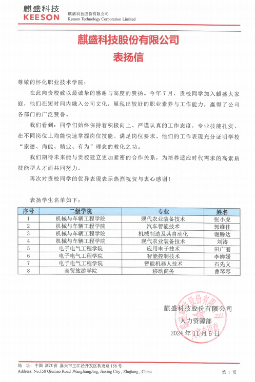 麒盛科技股份有限公司对我校学子提出表扬