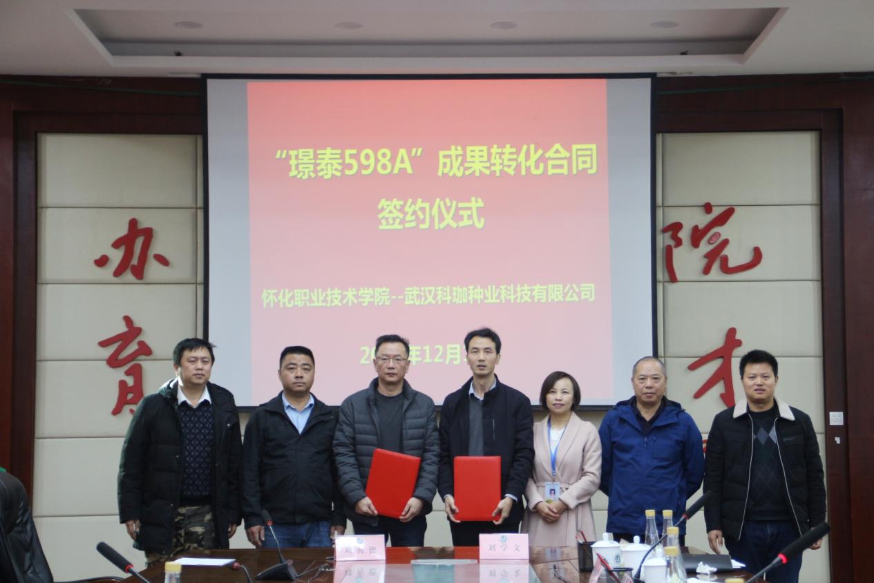 近日,学校与武汉科珈种业科技有限公司举行水稻三系不育系“璟泰598A”的成果转化签约仪式,标志着我校又一科研项目实现成果转化。党委副书记、校长刘学文,党委委员、党政办主任李亚玲,武汉科珈种业科技有限公司董事长刘俊德出席签约仪式。