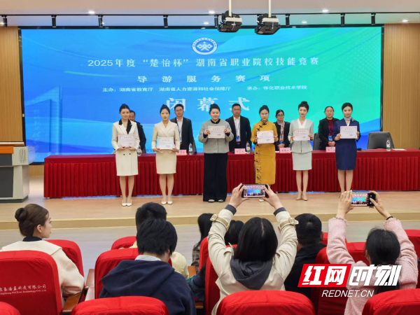 3月22日晚上,2025年“楚怡杯”湖南省职业院校技能竞赛导游服务赛项圆满结束,图为给为获得一等奖的同学颁奖。