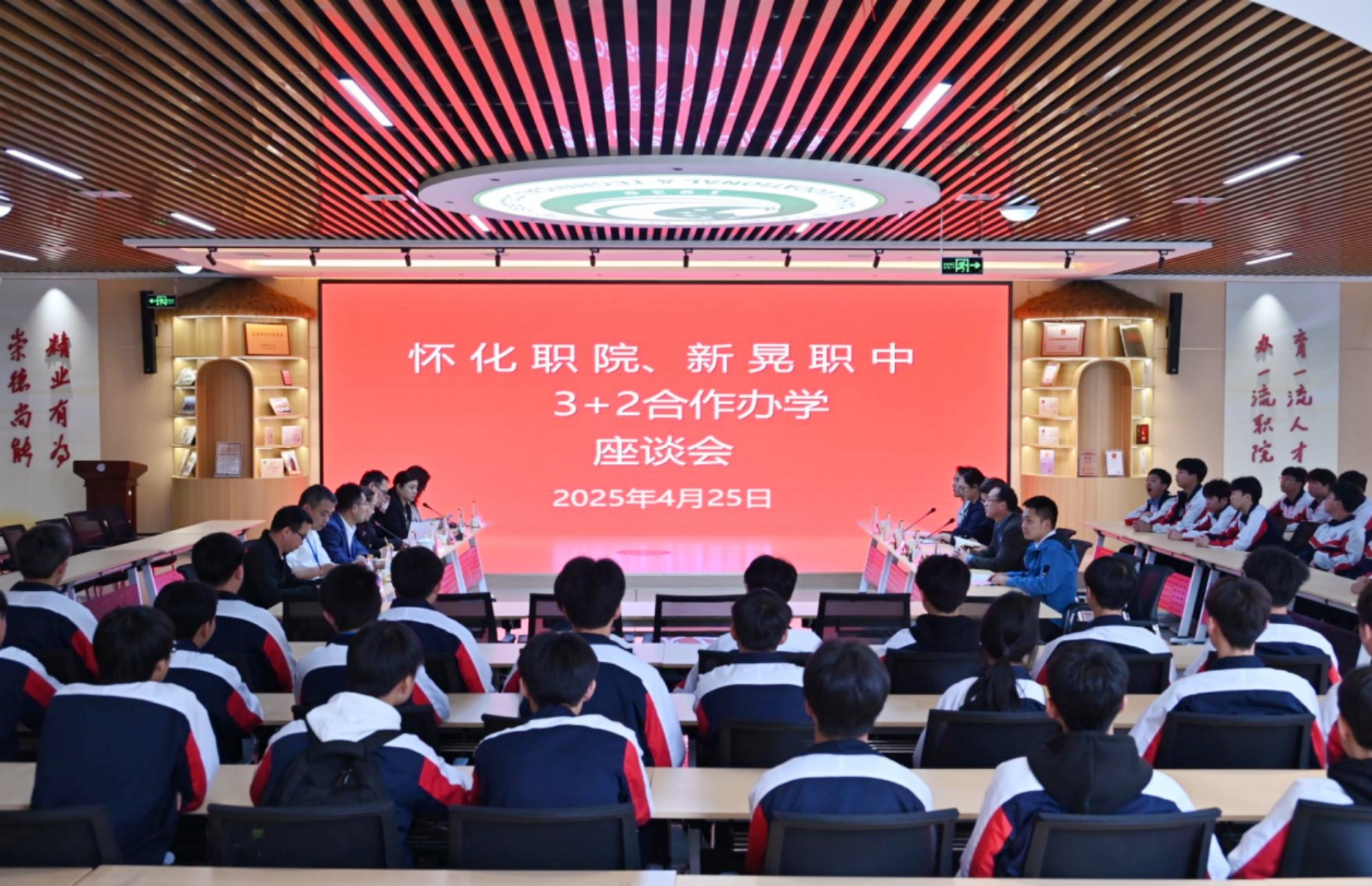 4月25日,新晃职业中等专业学校党支部书记、校长彭彩稳一行到学校交流学习。学校党委委员、副校长向敏出席,招生就业处、教务处相关负责人及汽车工程学院师生代表50余人参加座谈会。