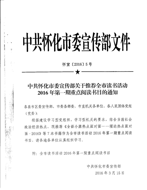 附:《中共怀化市委宣传不关于推荐全市读书活动2016年第一期重点阅读书目的通知》(怀宣【2016】5号)