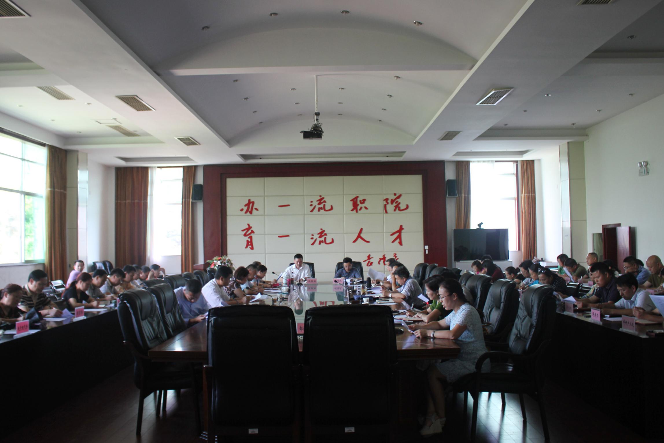 院长王聪田汇报了暑期参加省教育厅组织的高校领导干部研讨班的学习情况,重点讲述了国家教育部、省教育厅对创“双一流” 大学的实施意见及要求,同时提出我院作为地方性高职院校,有自己的优势和特色,必须要充分发挥自我优势和特色,从创“一流专业群”着手,努力跨入“双一流”大学行列。