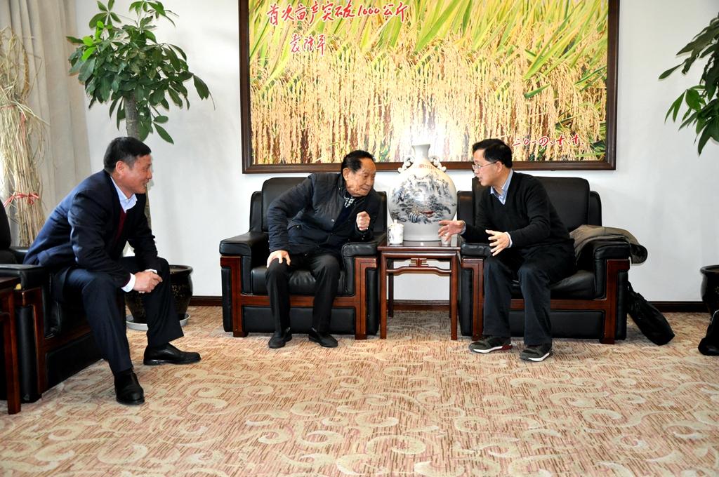 12月15日,我院党委书记胡佳武、院长王聪田一行赴长沙向袁隆平院士当面汇报学院近年来蒸蒸日上的发展局面以及未来的蓝图规划,袁院士对于学院所取得的成绩感到非常高兴,并主动提出捐资20万元作为怀化职业技术学院优秀学生的奖励基金。